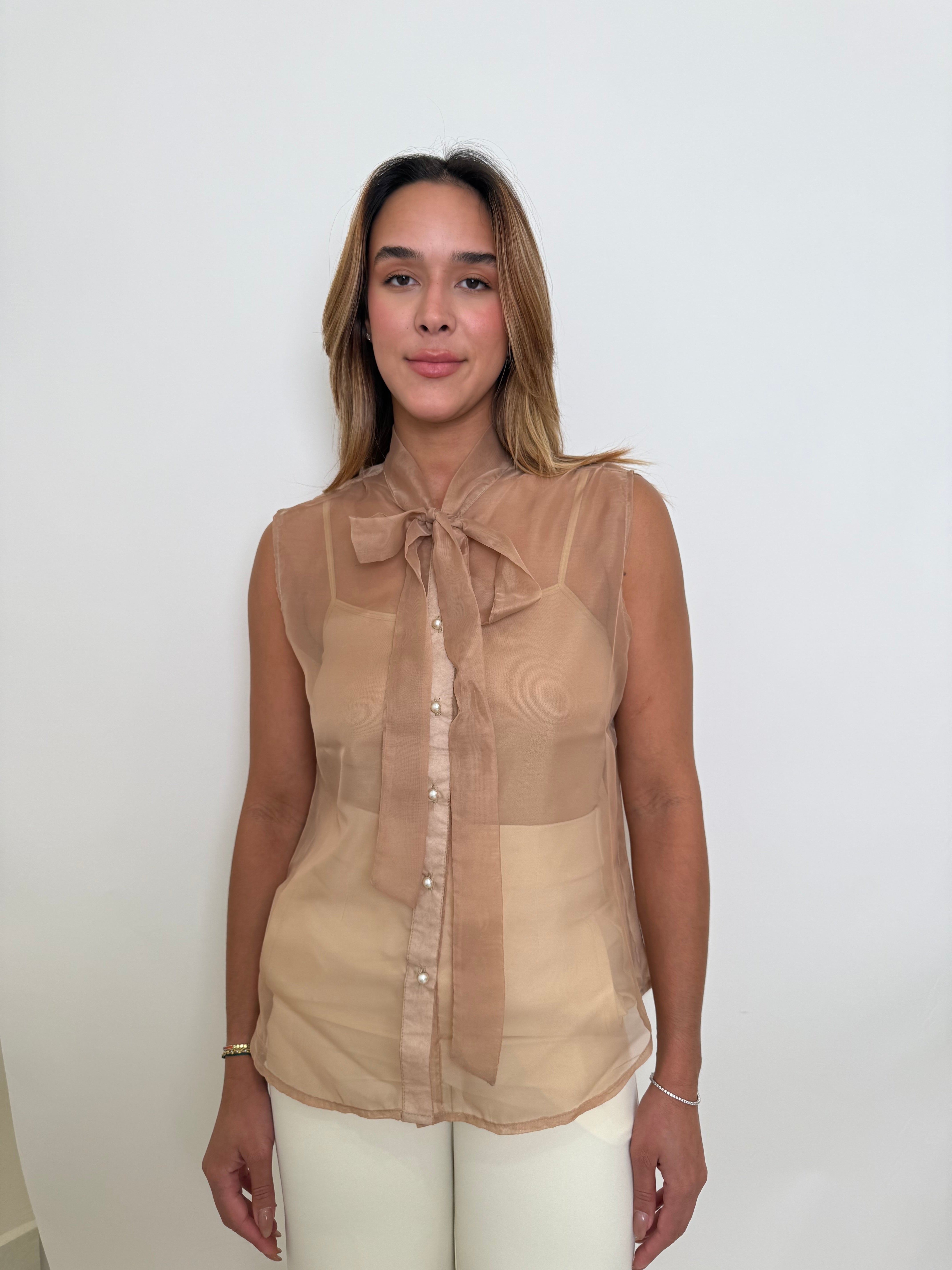 Detail: Solid sheer sleeveless top with bow neck and pearl buttons