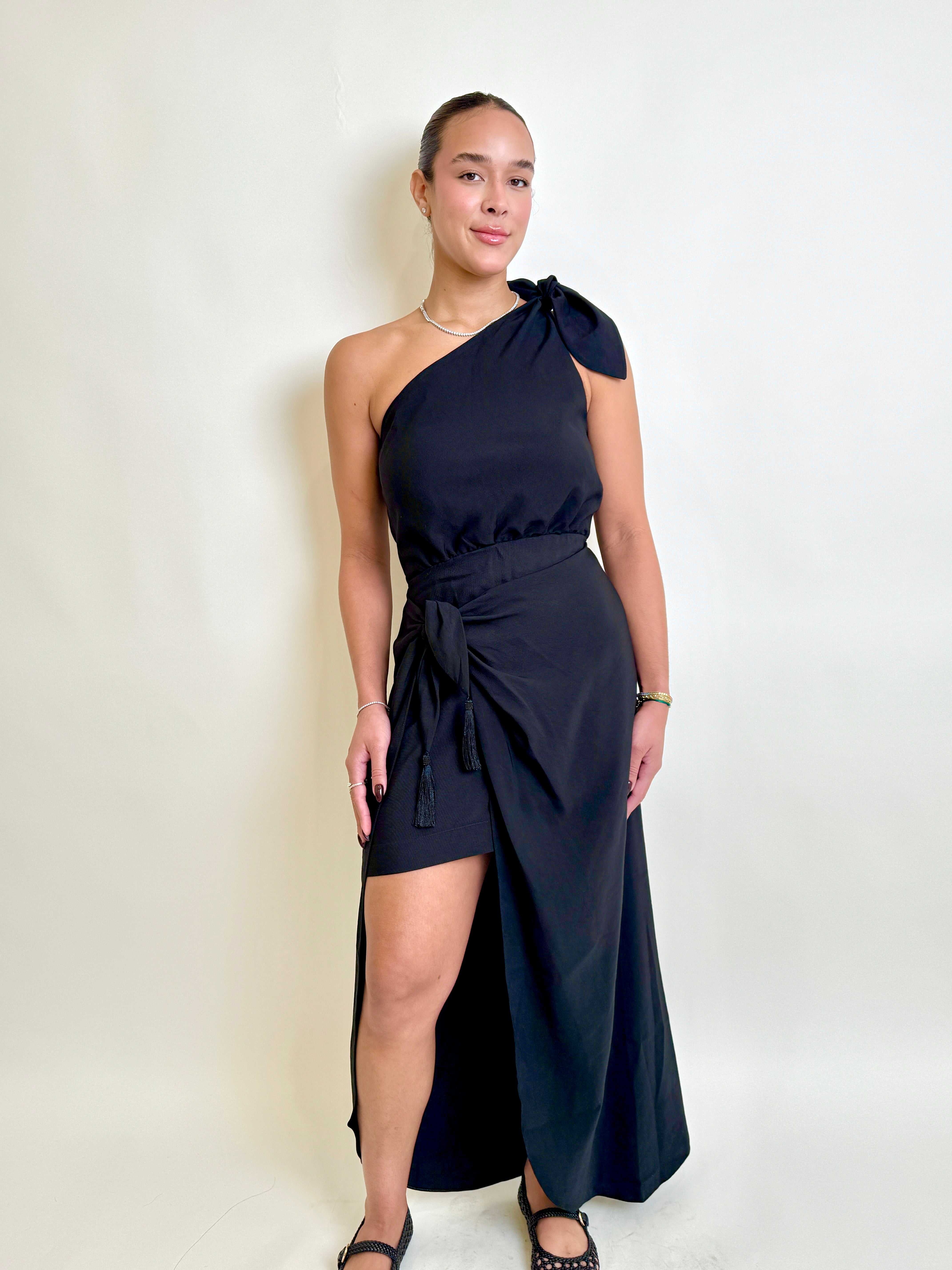 Details: One shoulder, short skirt with wrap-around pareo attachment