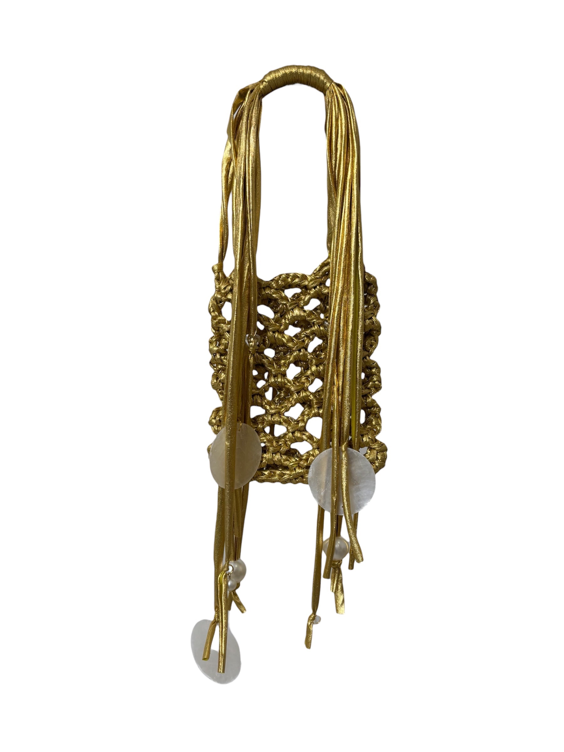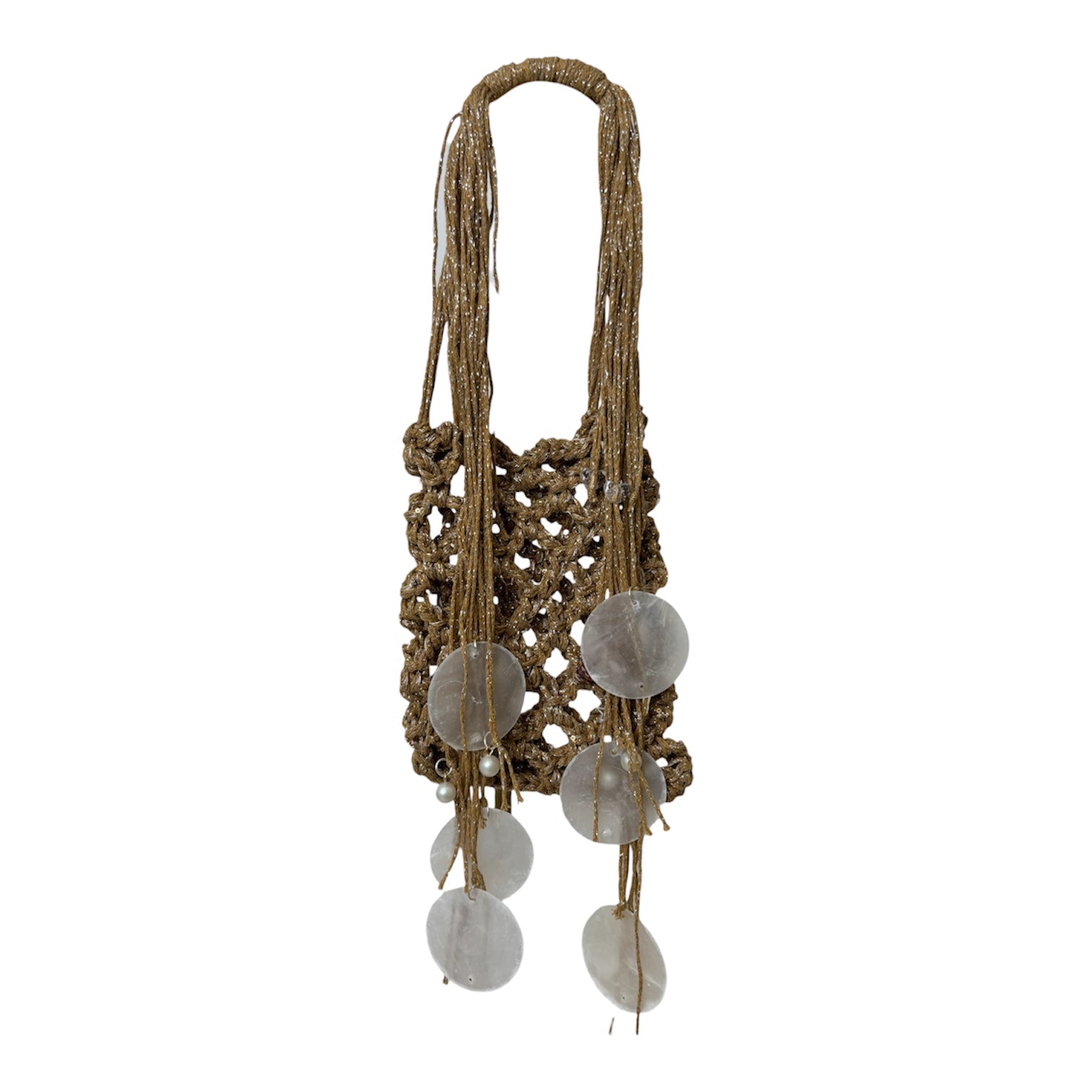 Small crochet design summer bag with short handle. Fringe details with charms. Can be worn on shoulder or hand