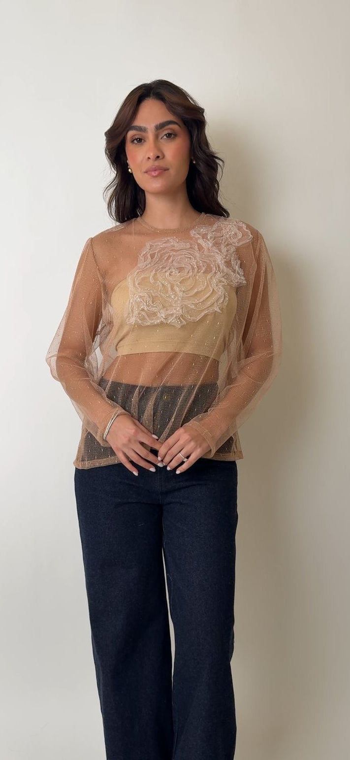 Details: Sheet tulle top with White Flower detail