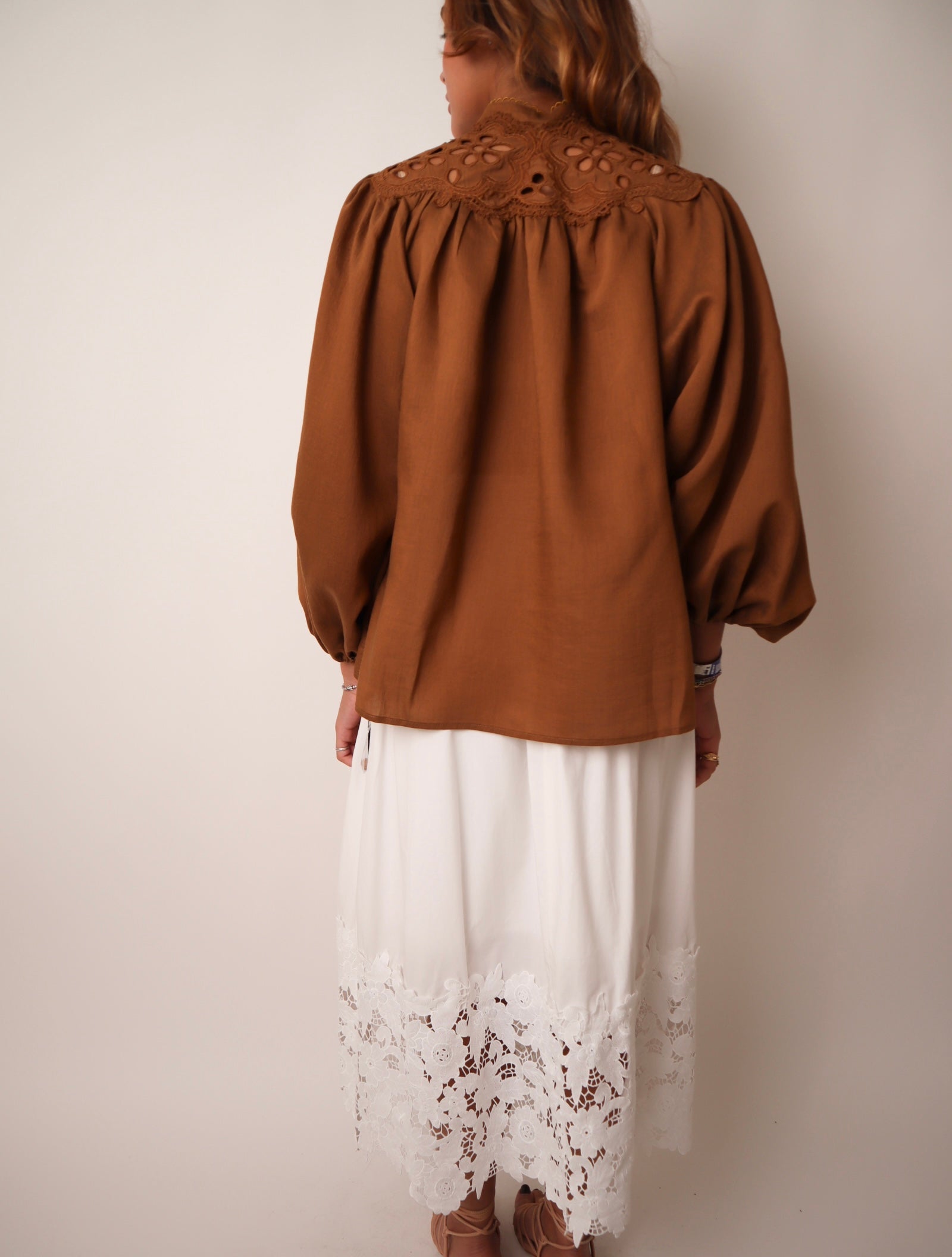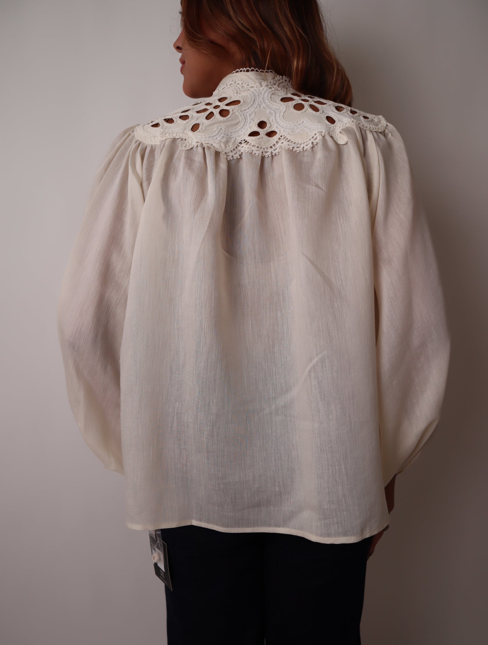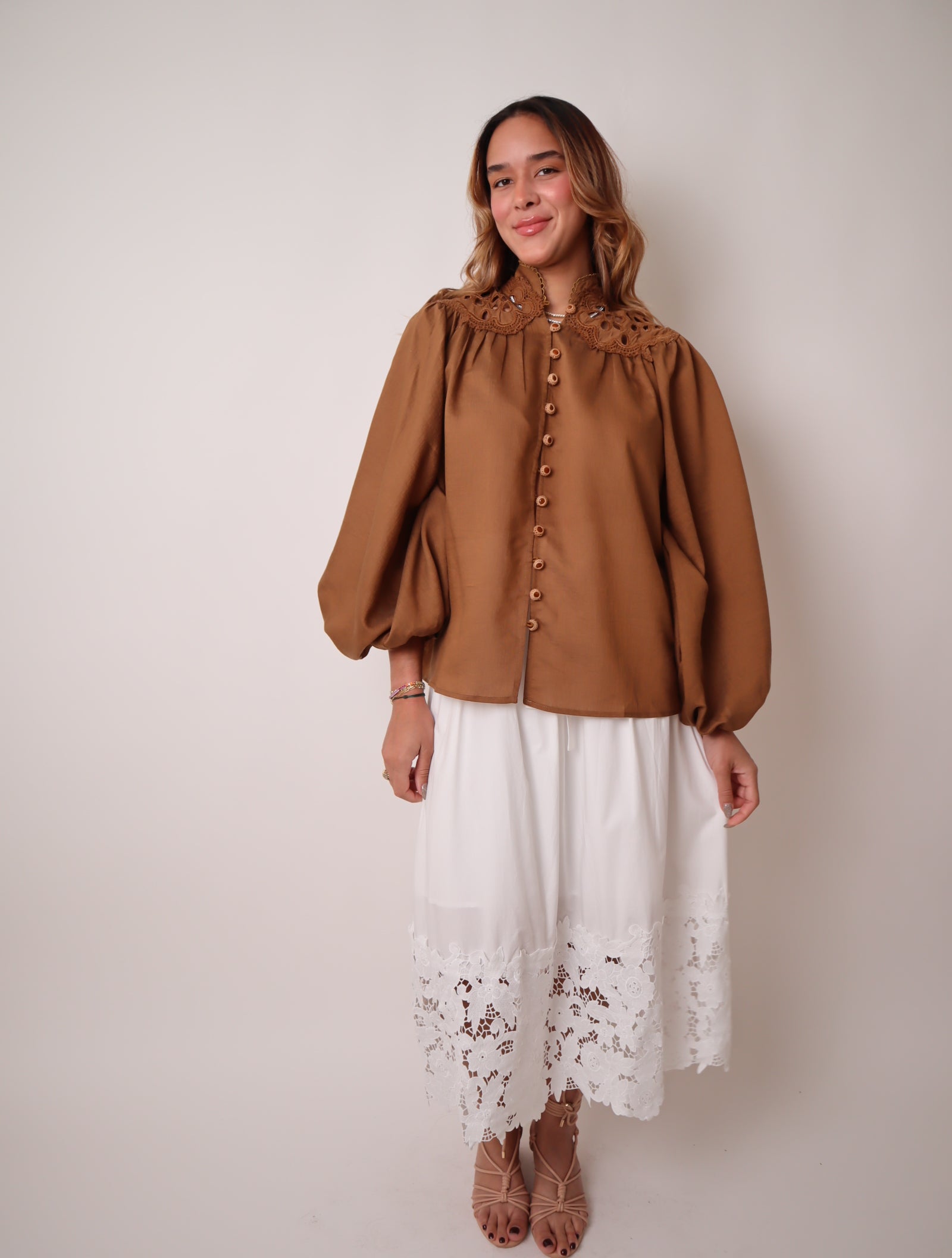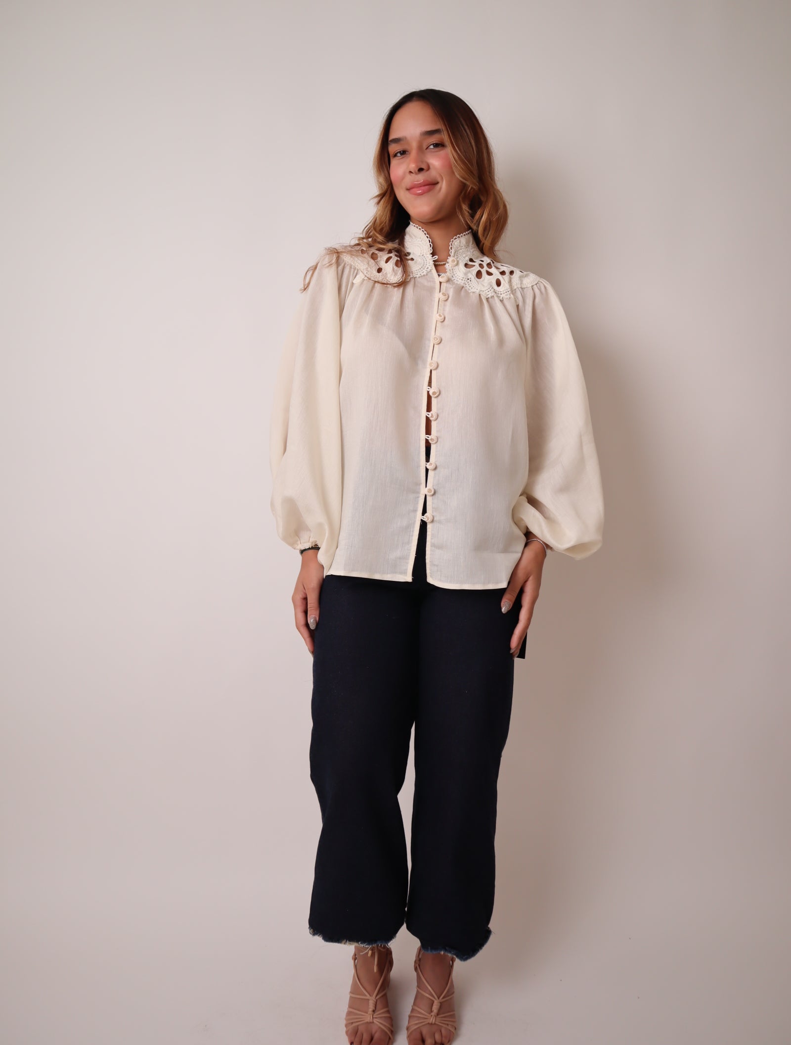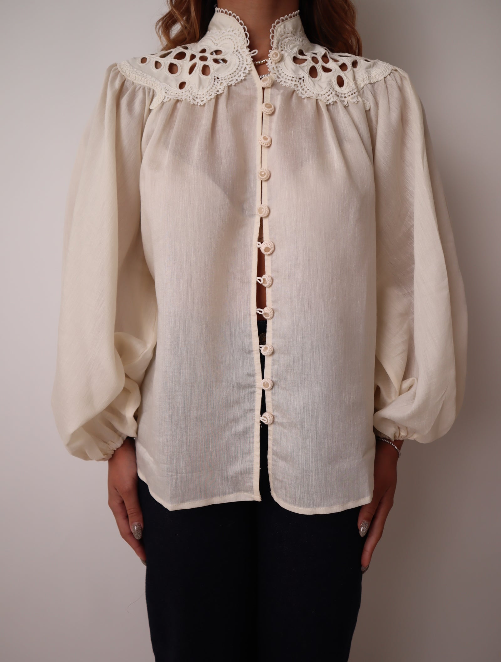 Button down, long sleeve shirt with scalloped lace trim along the neckline, Eyelet cutout detailing, gathered cuffs .