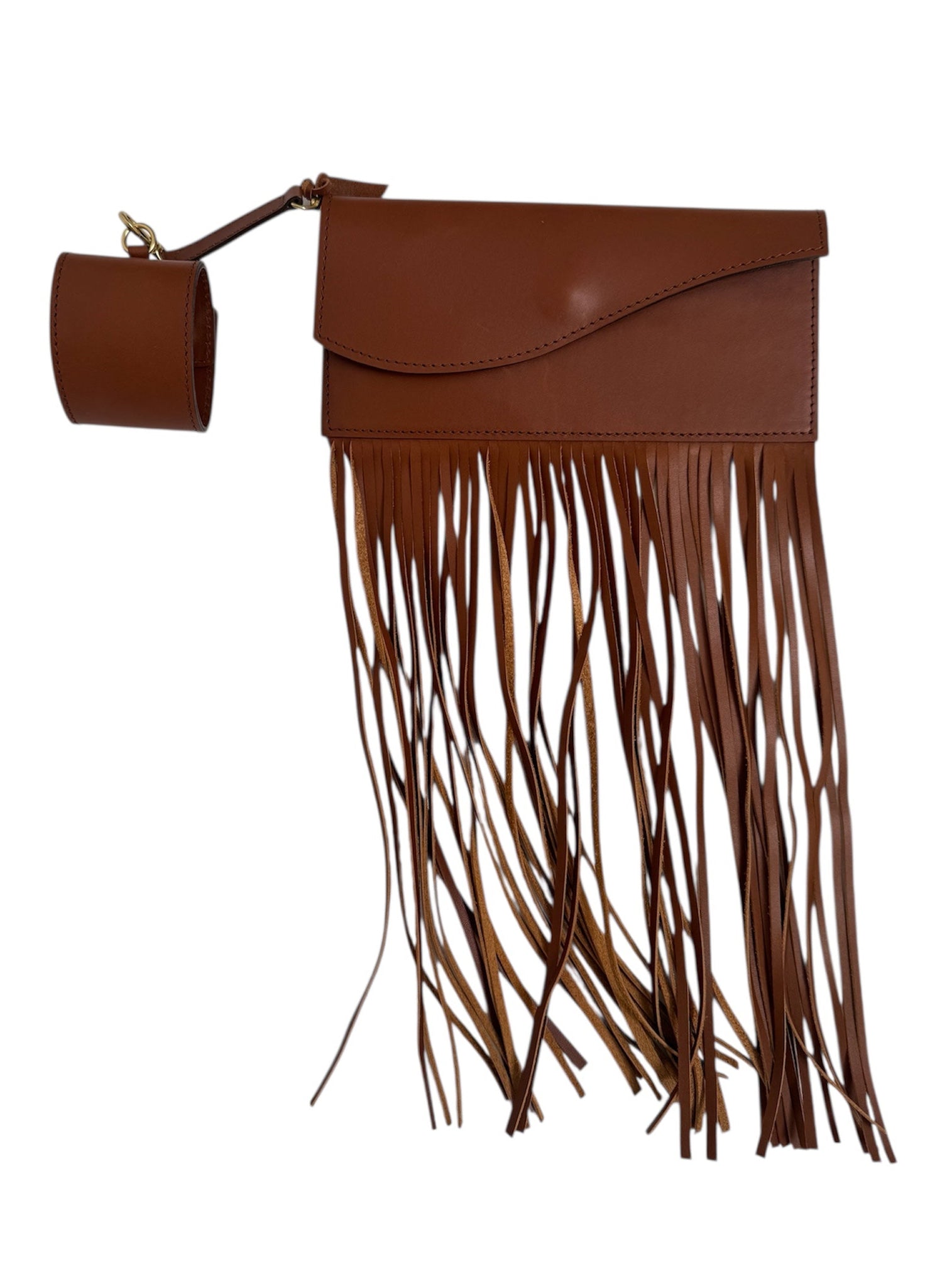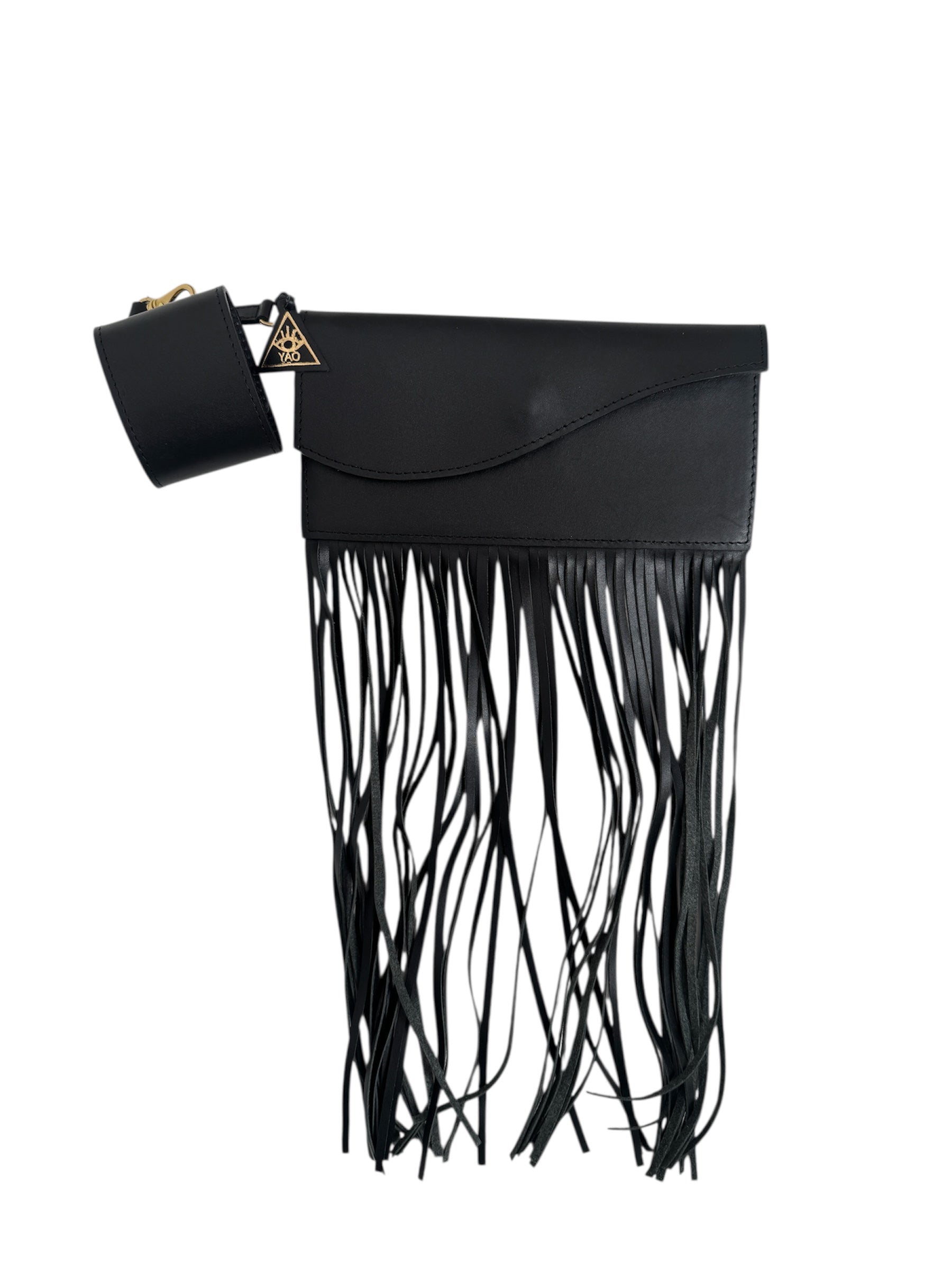Soft suede fringe for vibrant contrast and movement, slim profile, lightweight feel, magnetic snap closure for easy access, matching leather cuff