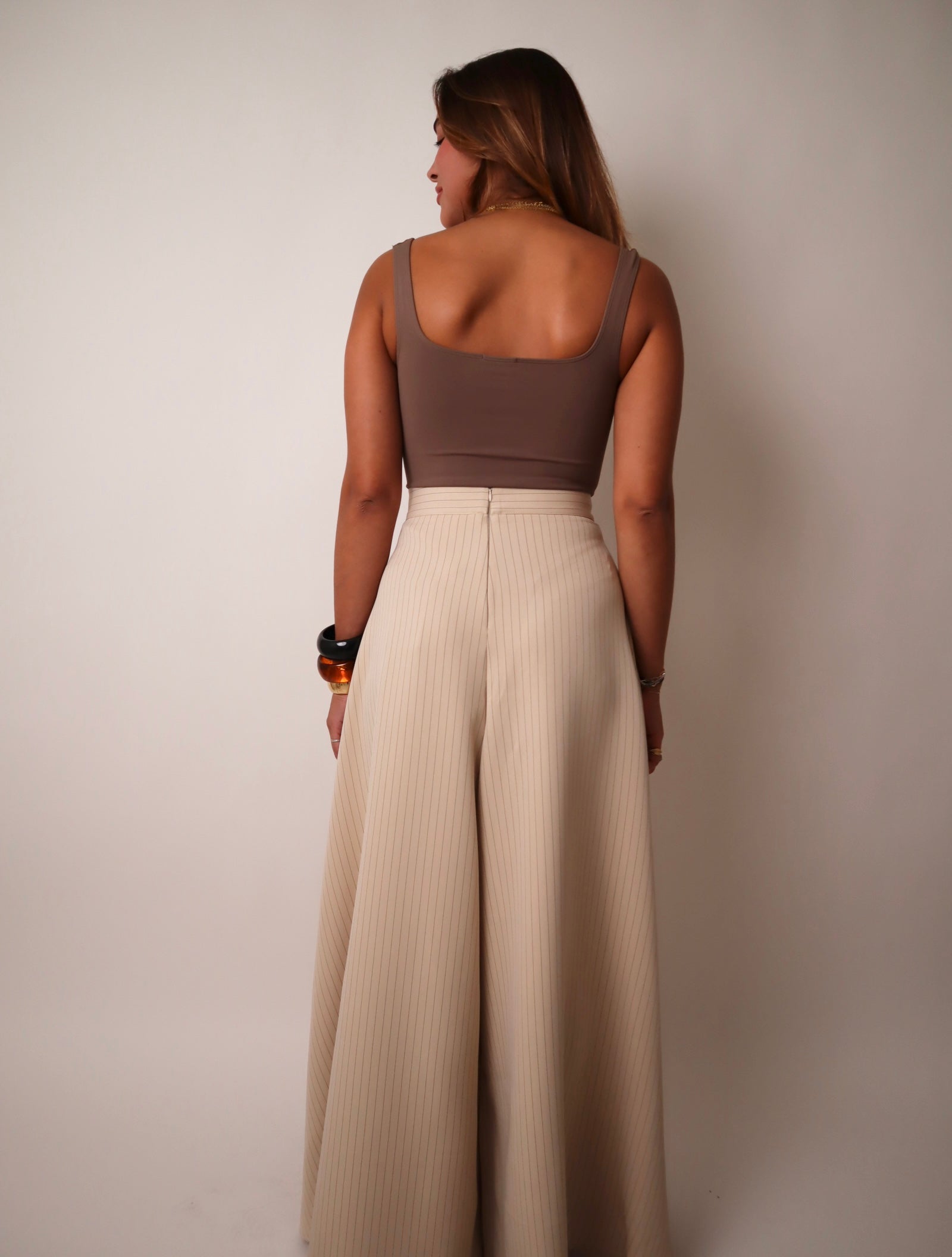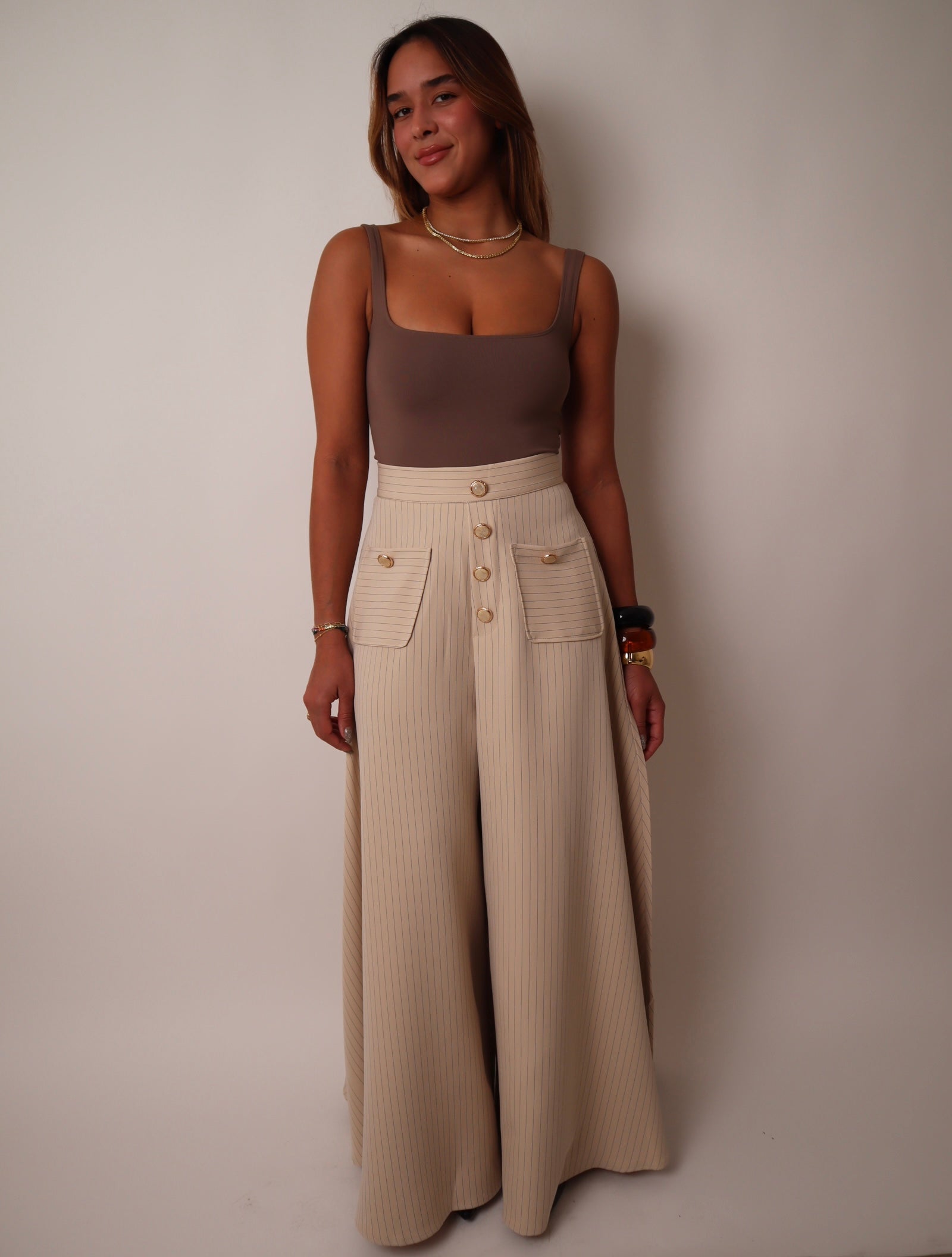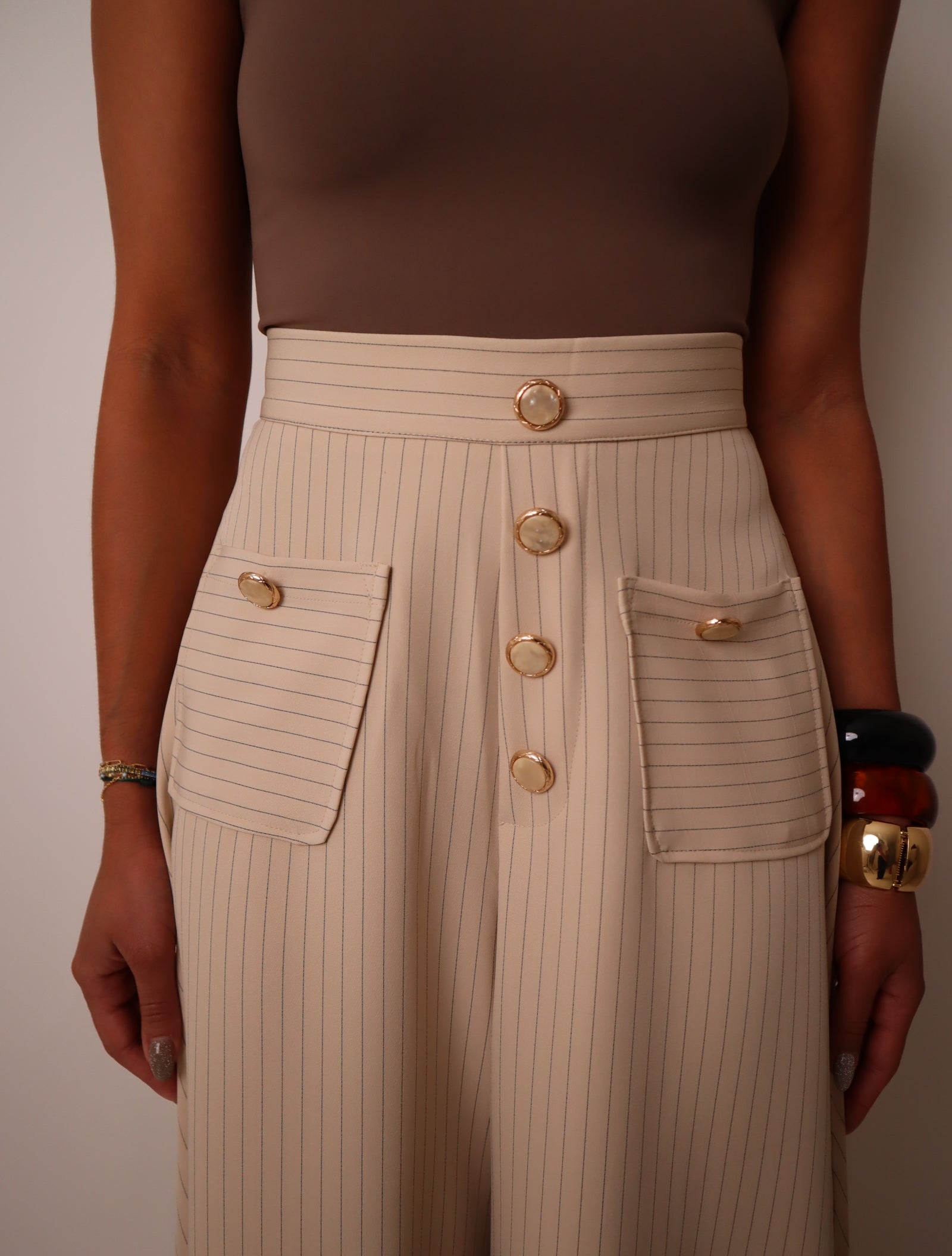 High-waisted tailored pants, wide leg, pinstripe pattern, button-front detail with pearly, gold buttons, front patch pockets with button accents, zipper closure.