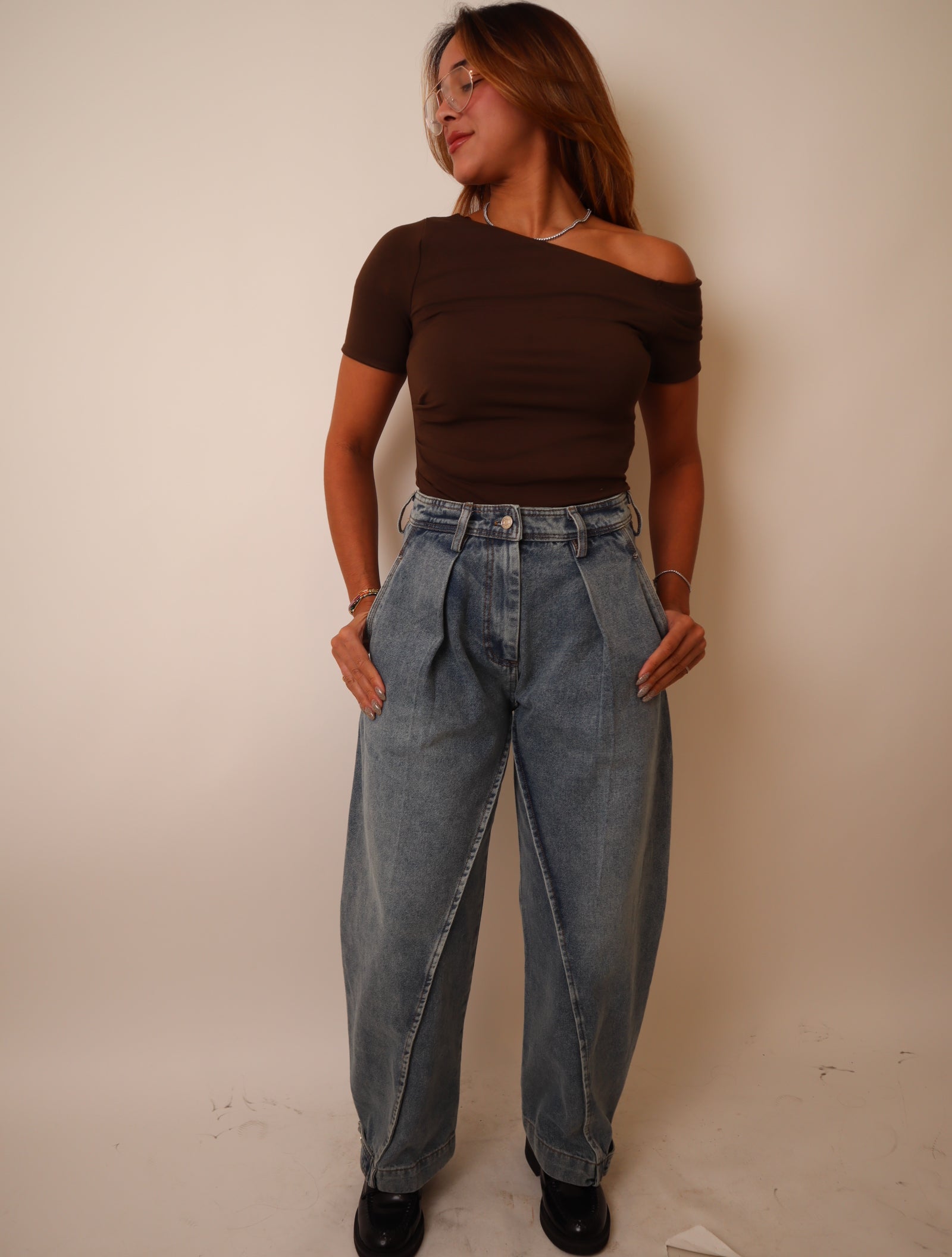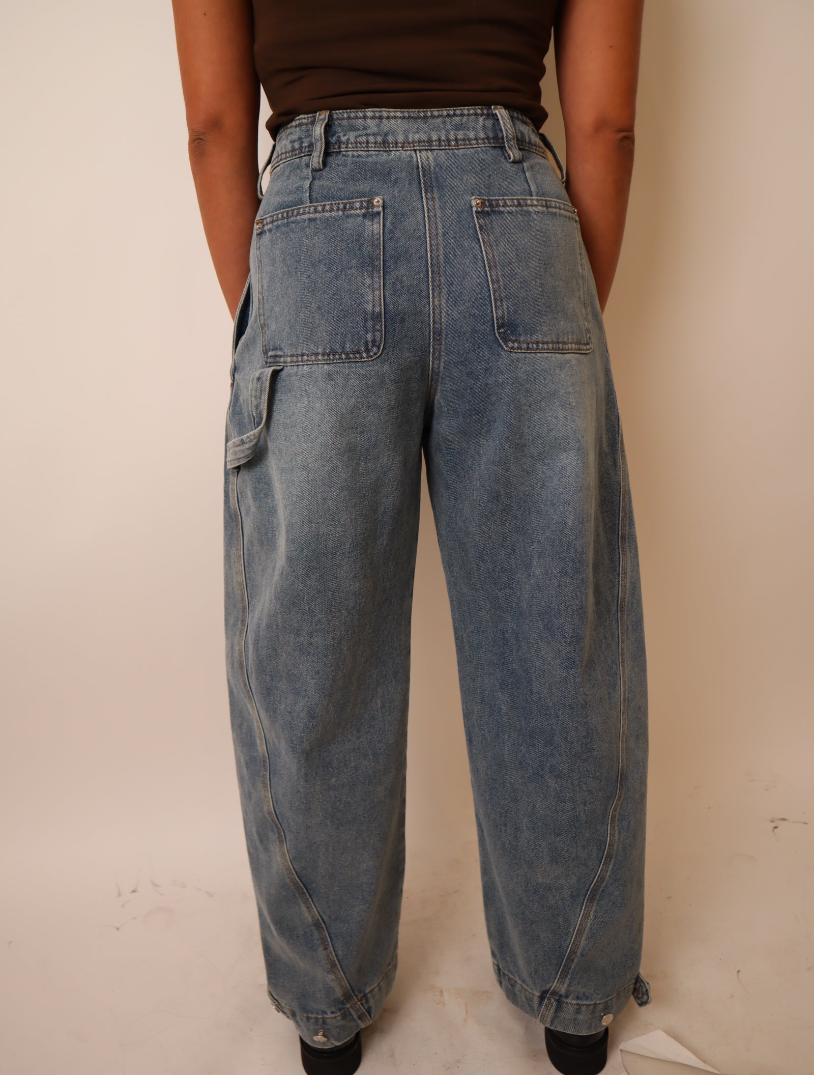 High-waisted, front pleat detailing, back patch with pockets, carpenter-style side loop, adjustable button closures at hem.