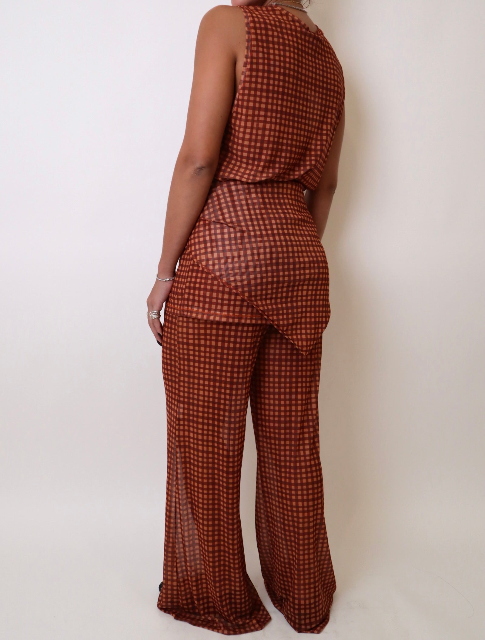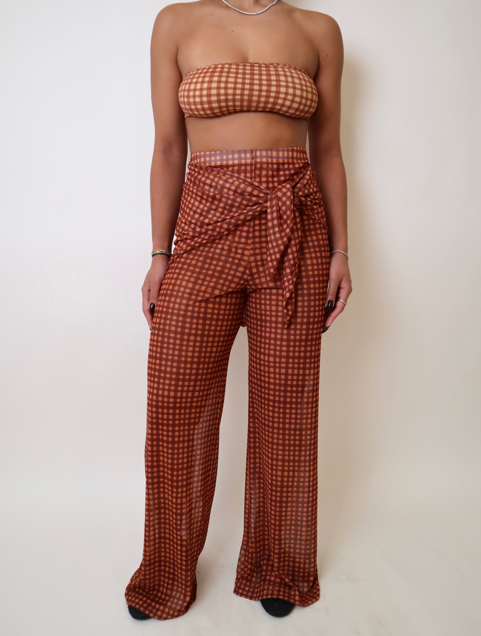 Details: Sheer printed pant with bikini bottom and sarong