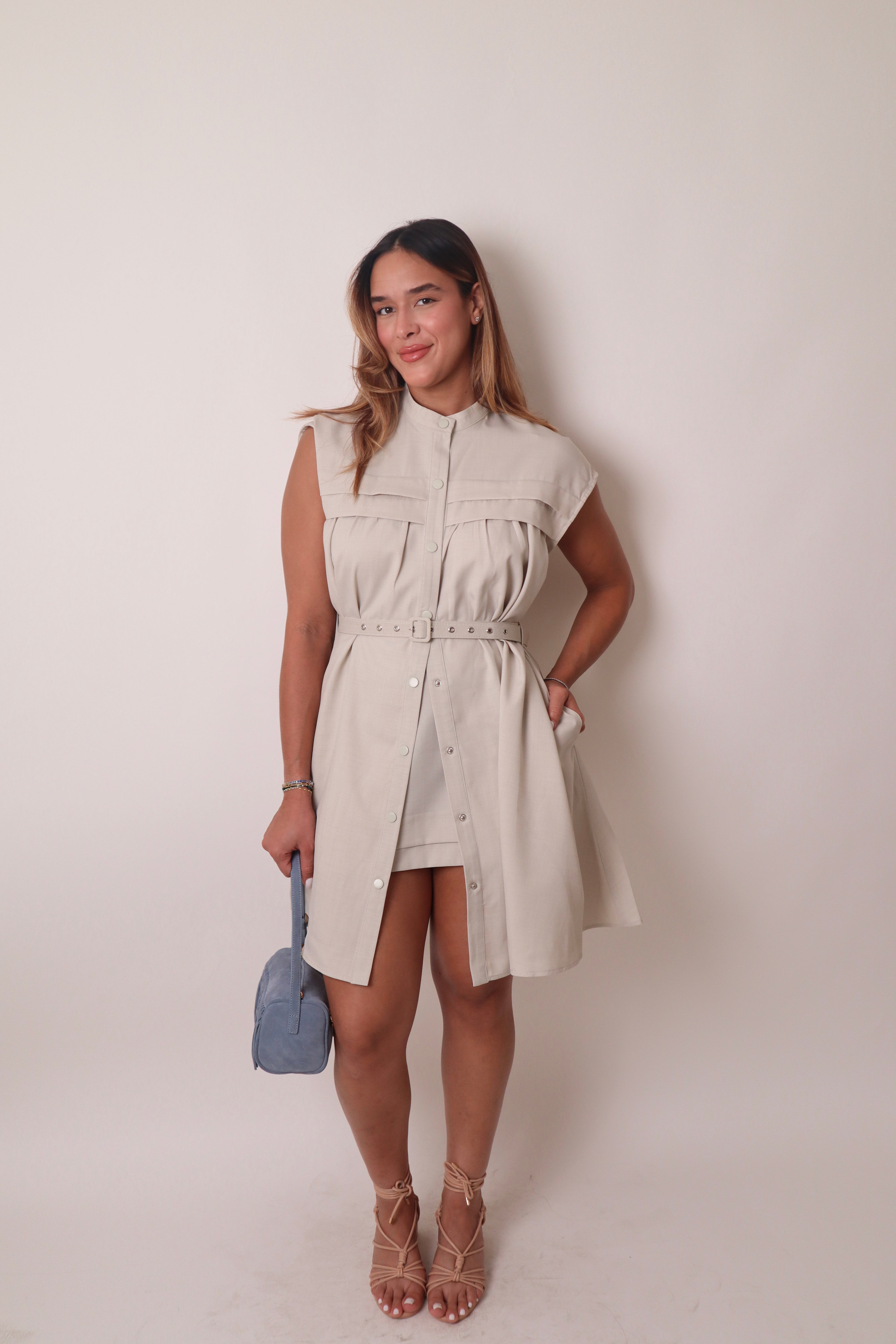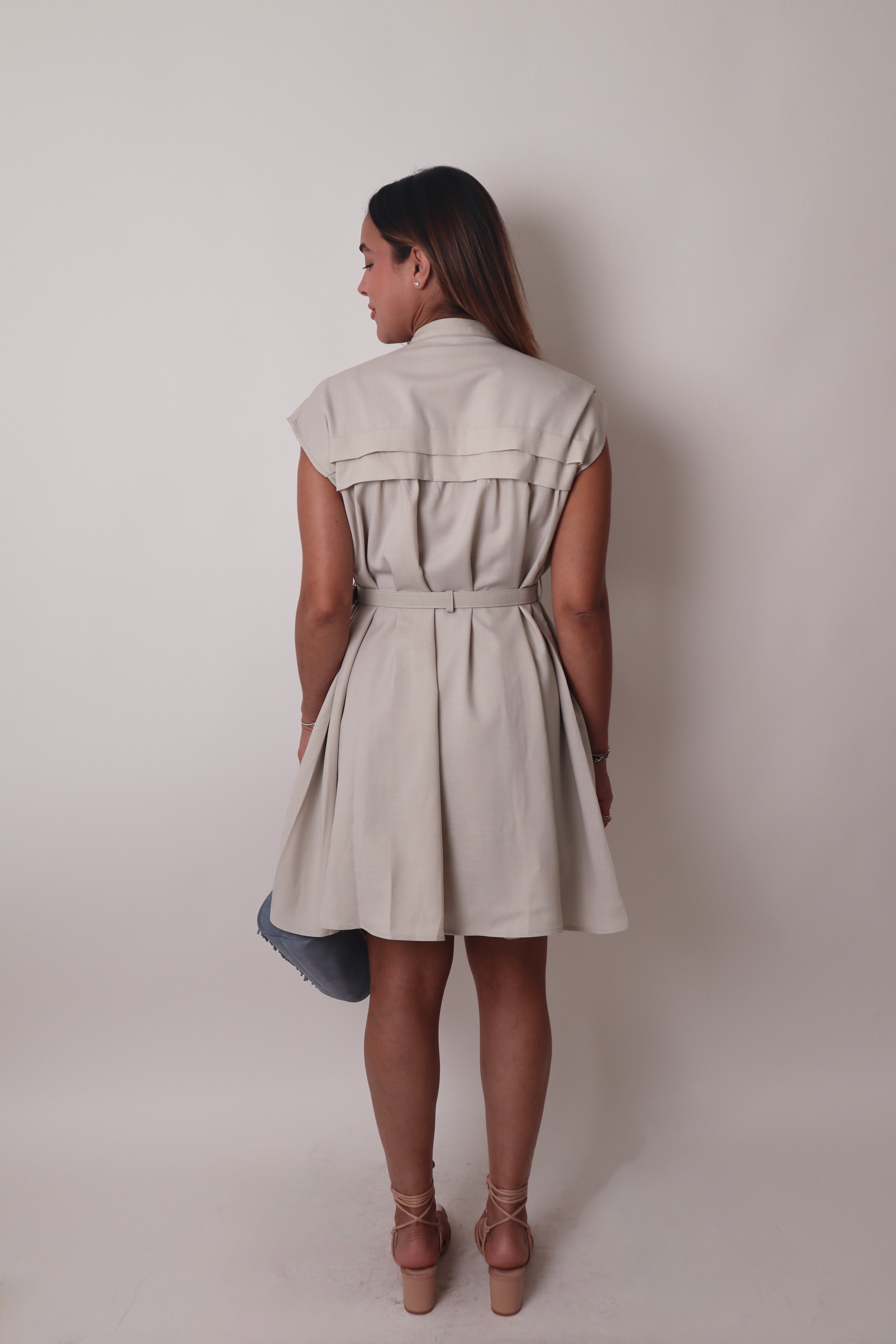 Details: Button down dress with belt and under skirt with back zip