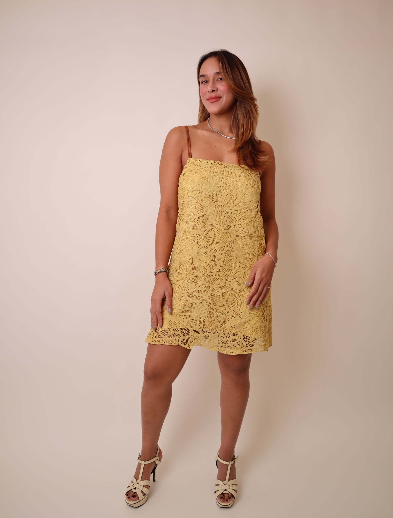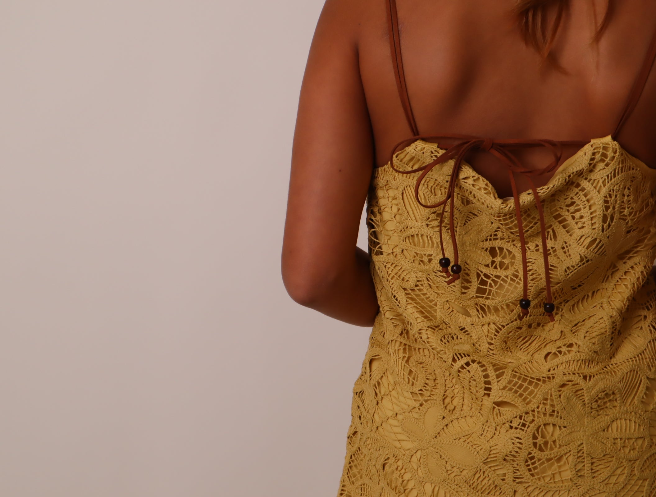 Floral crochet detailing, built-in lining, adjustable brown suede-like straps with bead detailing, can be worn as a top paired with the Tansy Pants.