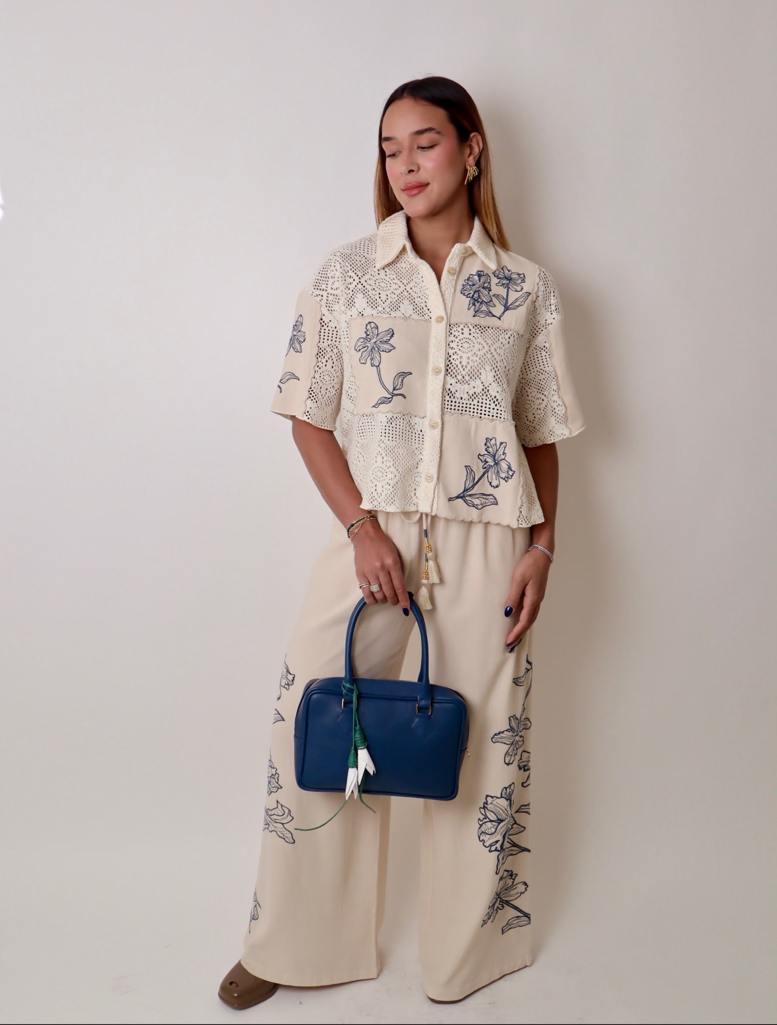 Details: Natural pants with blue floral embroidery to the sides